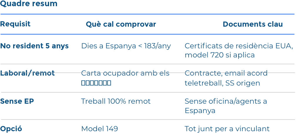 Presenteu el model 149 amb comunicació a Hisenda, adjuntant contracte laboral, alta SS (o manteniment EUA), carta de l'ocupador amb data d'inici i durada, i prova de no residència prèvia. Vinculant si tot quadra.