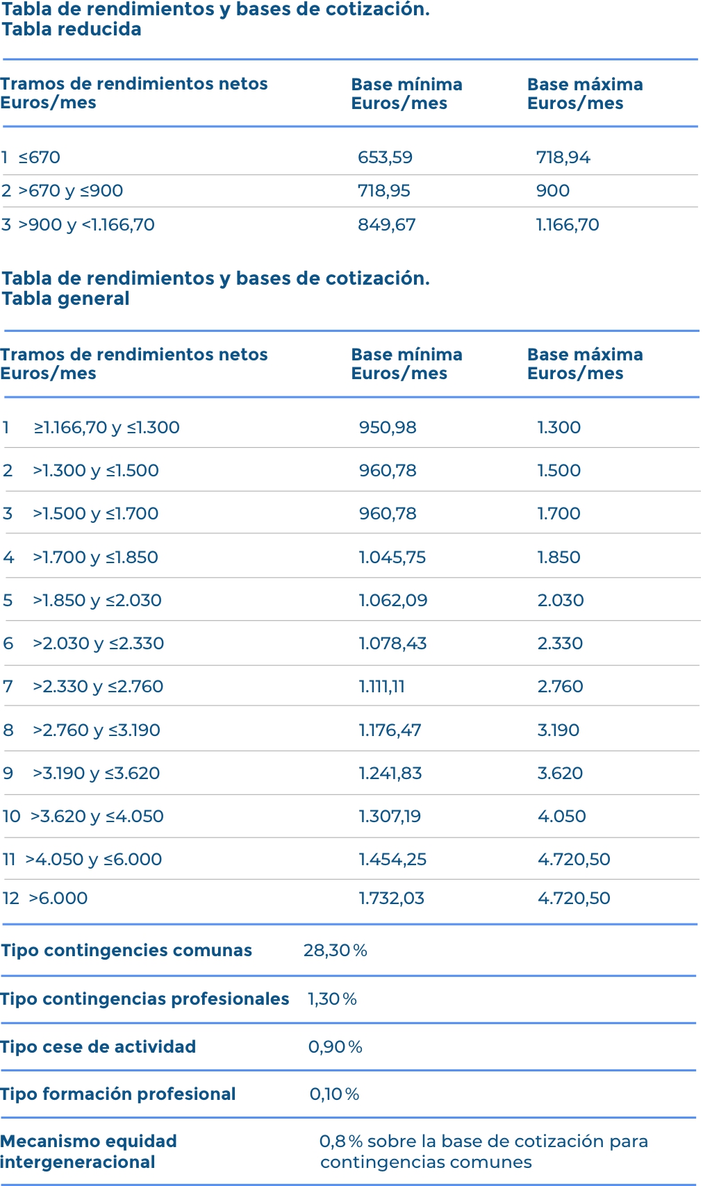 La base de cotización en este régimen especial será la elegida por el trabajador entre las bases mínima y máxima que le corresponda. A excepción de algunas particularidades, durante el año 2025 la tabla general y la tabla reducida y las bases máximas y mínimas aplicables a los diferentes tramos de rendimientos netos son las siguientes:
